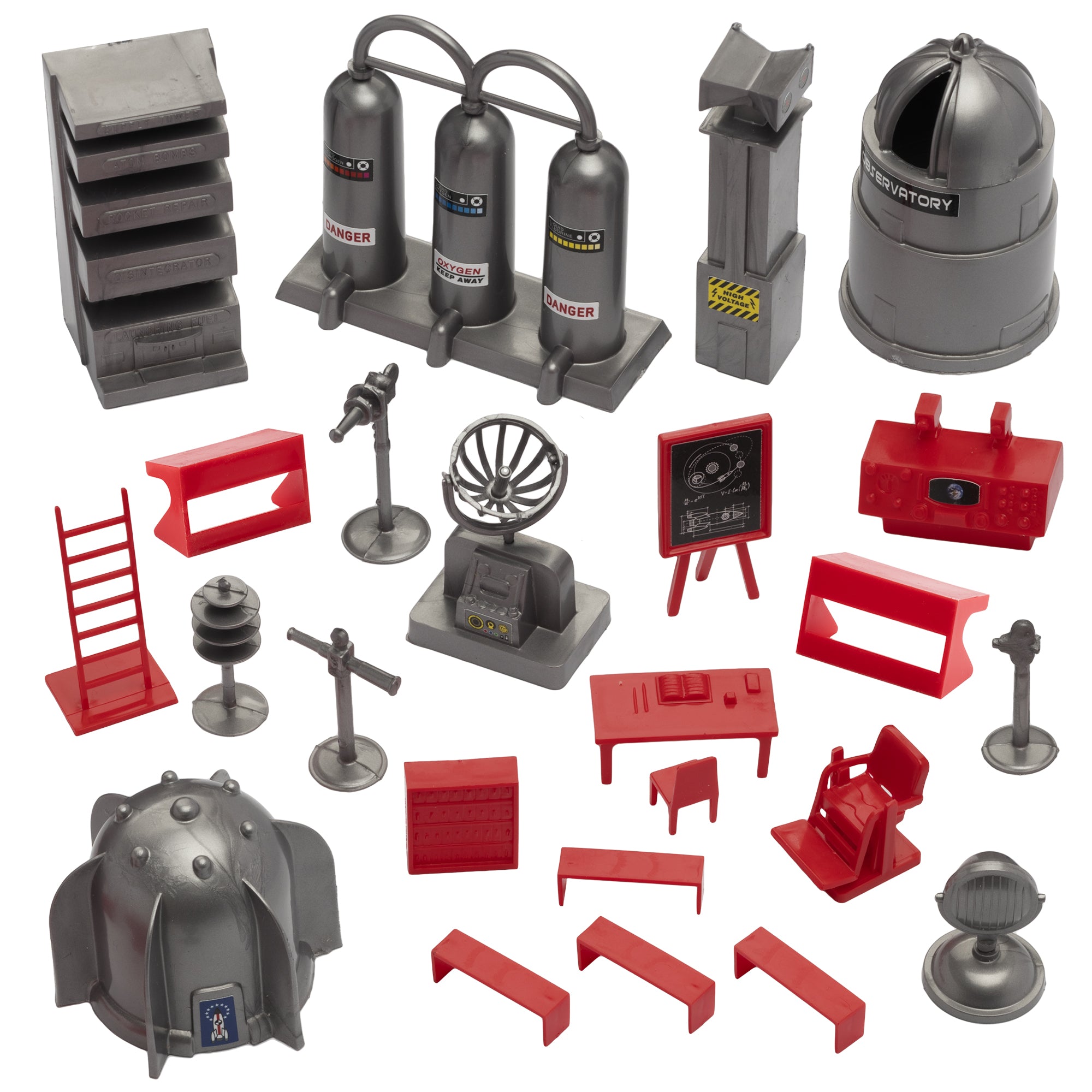 From the Classic Army Men Collector Series, BMC Toys brings back more classic toys from yesteryear. This 24 piece Set of includes a variety of space themed accessories and furniture. The following pieces are made from slightly stiff Stainless-Steel color HDPE plastic: Gravity Chamber, Observatory Dome with skylight, 3 chamber Fuel Tank, Radar Antenna, Supply Cabinet, Speaker Tower, Laser on Stand, Searchlight on base, Camera on stand, Telescope on stand, and Disc Antenna. These pieces are made from slightly stiff red HDPE plastic: Teacher Desk, Chair, Easel, Ladder, 2 Student Desks, 4 Student Benches, Control Chair, and Control Console. These accessories were first offered in the 1950s by Louis Marx and Co. and were included in a number of their legendary Playsets spanning many years including Tom Corbett Space Academy, Space Patrol, Rex Mars, Captain Space, Cape Canaveral, Operation Moonbase, Martian Landing and even the 1979 Galaxy Command Playset during the Star Wars craze. This new production is manufactured using the original plastic injection tools. This is a Set of real American Made plastic toys, meant to be set up, knocked over, picked up, and played with for many years to come. Packed in clear bag bag with insert card and recommended for ages 5 and up.