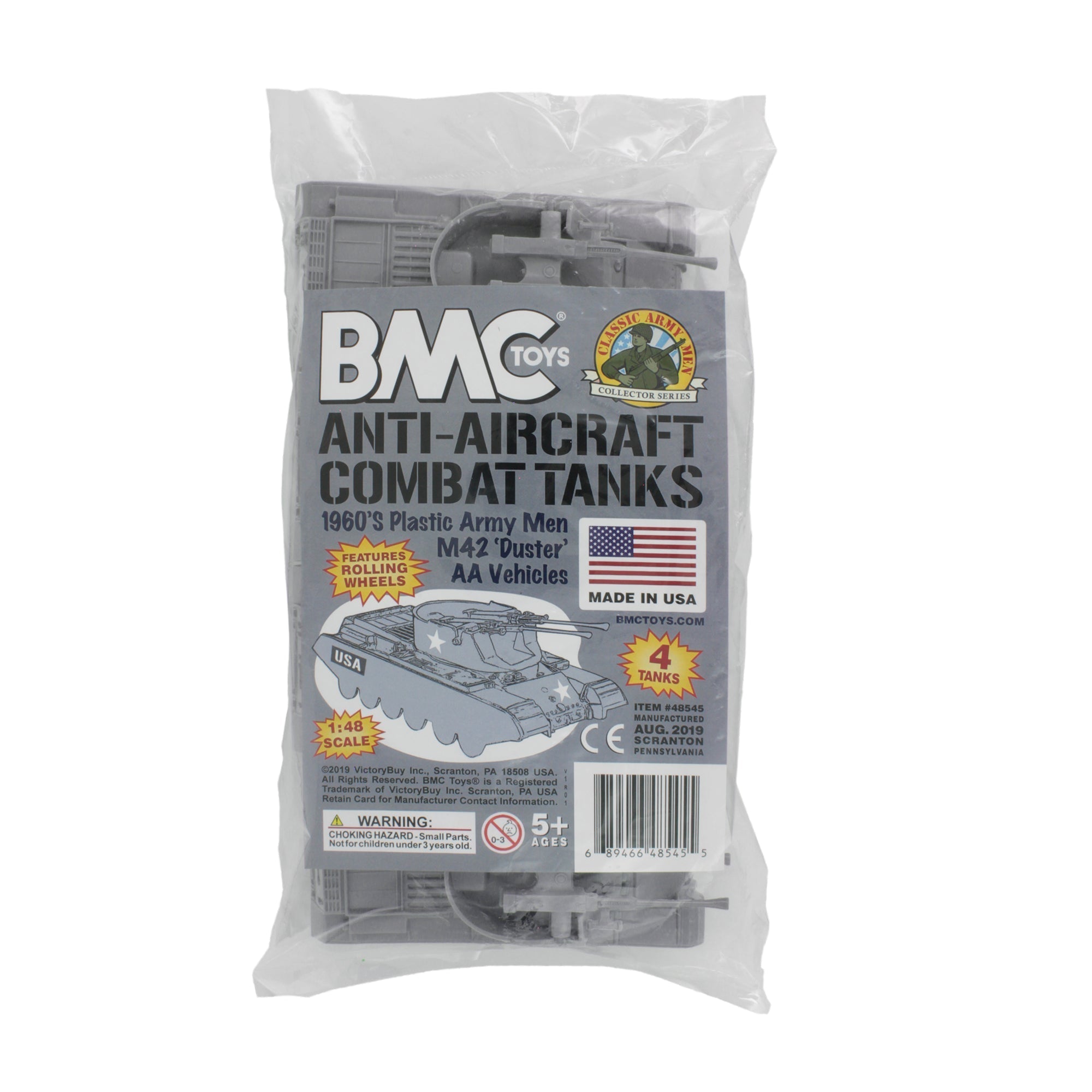 From the Classic Army Men Collector Series, BMC Toys brings back another American toy from yesteryear. This pack of 4 'Duster' Anti-Aircraft Tanks is proudly manufactured in the United States. The Set includes 4 gray vehicles and features barrells that pivot, turrets that rotate, and rolling wheels. Tanks are approximately 1:48 scale and are made from slightly flexible HDPE plastic with medium detail and very little flashing. These Tanks were originally produced in the 1960s by PAYTON and were included in numerous plastic military Playsets from several companies over the years. They were even copied and produced overseas in the 1980s. Even in the 21st century they're still great reinforcements for your Plastic Army Men forces, and also just the right size for O-gauge train flatbed cars. This is a Set of real American Made plastic toys, meant to be rolled around, knocked over, picked up and played with for many years to come. Packed in clear bag bag with insert card and recommended for ages 5 and up.