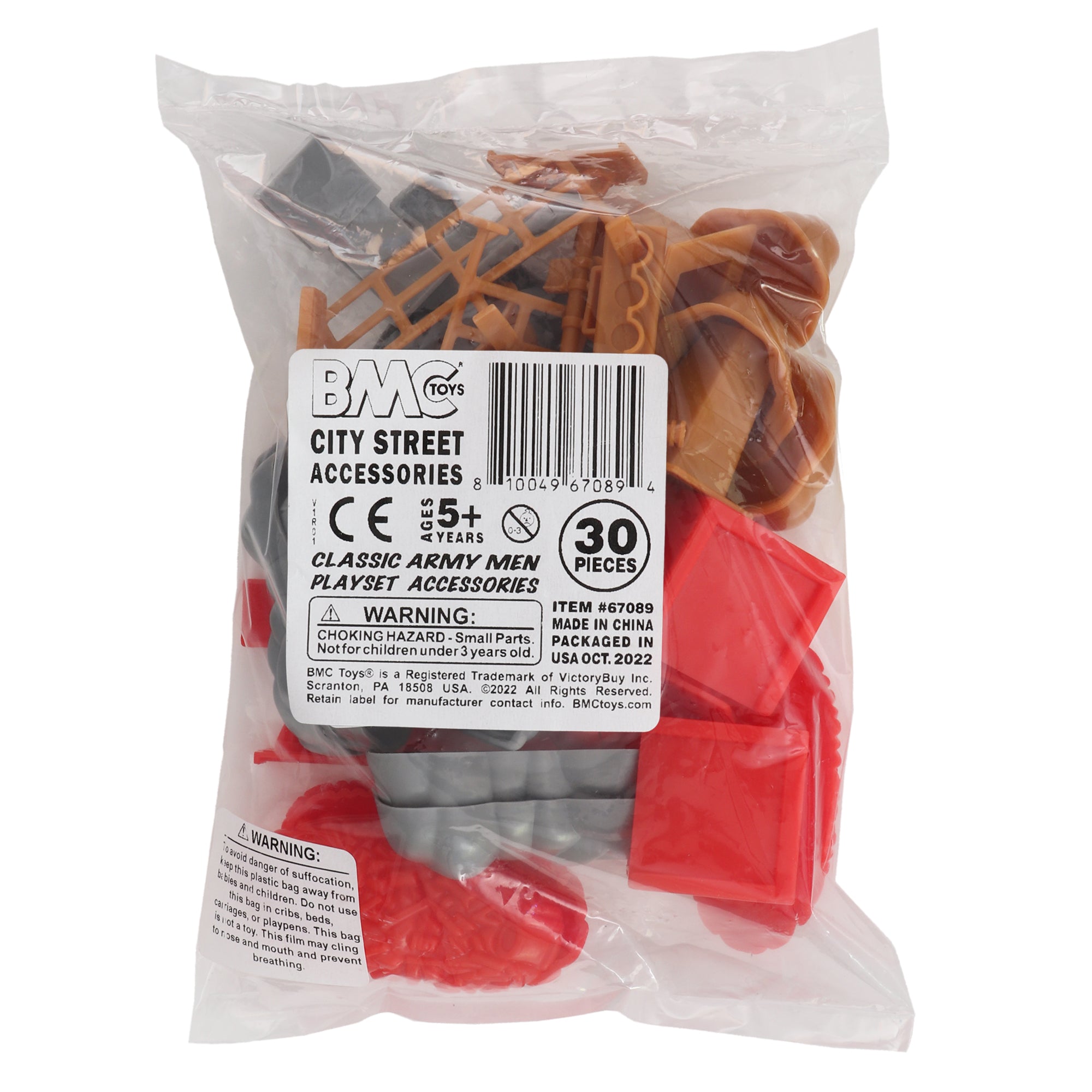 From the BMC Toys Classic Army Men Collector Series. This 30 piece Set includes accessories made from slightly stiff polypropylene plastic. Red color pieces include 2 each traffic lights, fire hydrants, Large crates and 4 trash piles. Gray color pieces includes 2 each gas pumps, crushed cars, logs and 4 rocks. Caramel tan color pieces include 2 each traffic lights, fence barriers, concrete barriers, and 4 small rocks. Traffic lights stand 3.5 inches tall and scales vary from approximately 1:18 to 1:48. This Set includes parts that were originally imported from China by Processed Plastic Co. (Tim Mee Toy's parent company) to be included in various Firemen, Construction, and 4x4 Monster Truck Playsets. While best known for manufacturing toys in the United States, Processed Plastic Co. imported some parts in later years to keep costs down. Packed in clear bag bag with label and recommended for ages 5 and up.