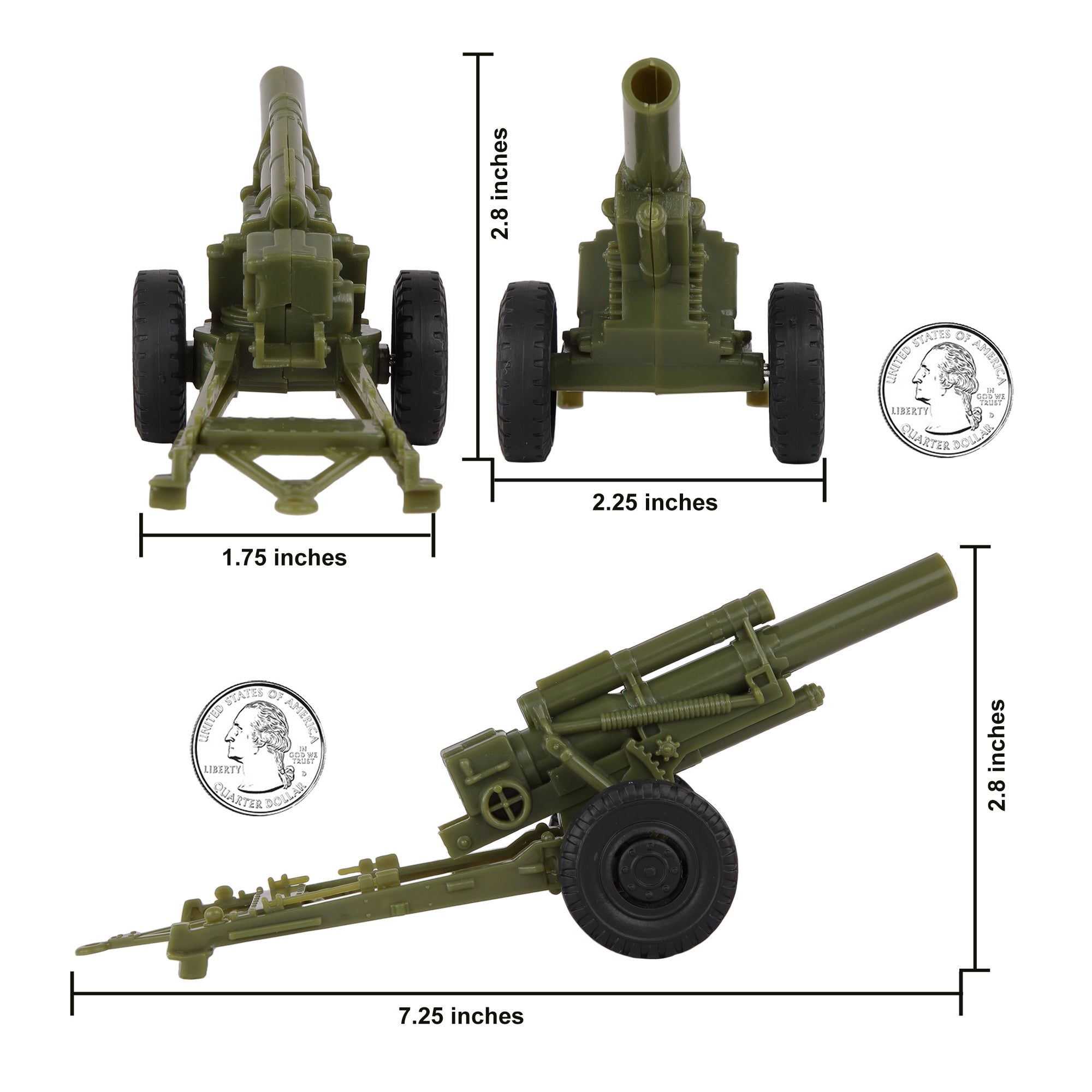 From the BMC Toys Classic Toy Soldier Collector Series, small field Artillery that packed a big punch. The WW2 US Artillery 12 piece Plastic Army Men Set features a long barrel howitzer, 2 short barrel howitzers, and 9 crew figures in 3 different poses. Both Artillery models have rolling wheels with metal axles, and the short barrel cannon feature barrels that elevate and movable trailing arms. Soldiers include 3 man Artillery crew. Figures are made from OD-Green color soft plastic with lots of detail and stand up to 2.4 inches tall. Artillery is made from OD-Green hard plastic and measure up to 2.8 inches tall and 7.5 inches long. All pieces are approximately 1:32 scale.