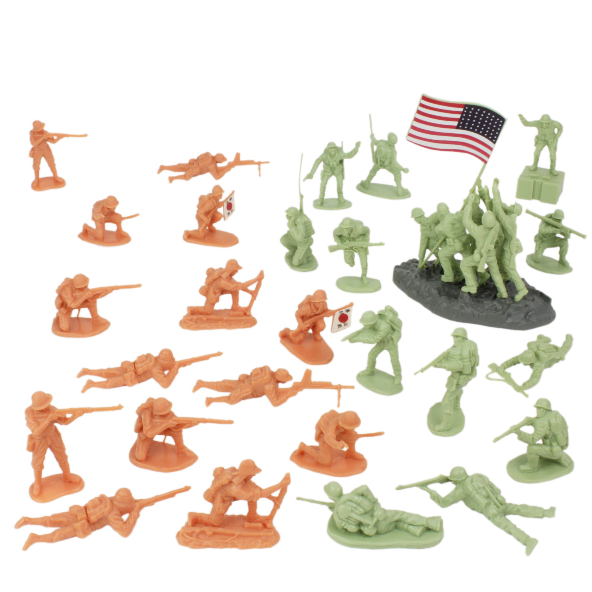 From the BMC Toys American Hero Collector Series, the most iconic moment from the Pacific War theater: The Battle of Iwo Jima 32 piece Plastic Army Men Set features 6 Marines raising the American flag on Mount Suribachi, plus 19 different figures including 12 United Stated Marines in sage green and 14 Japanese Soldiers in butternut tan.