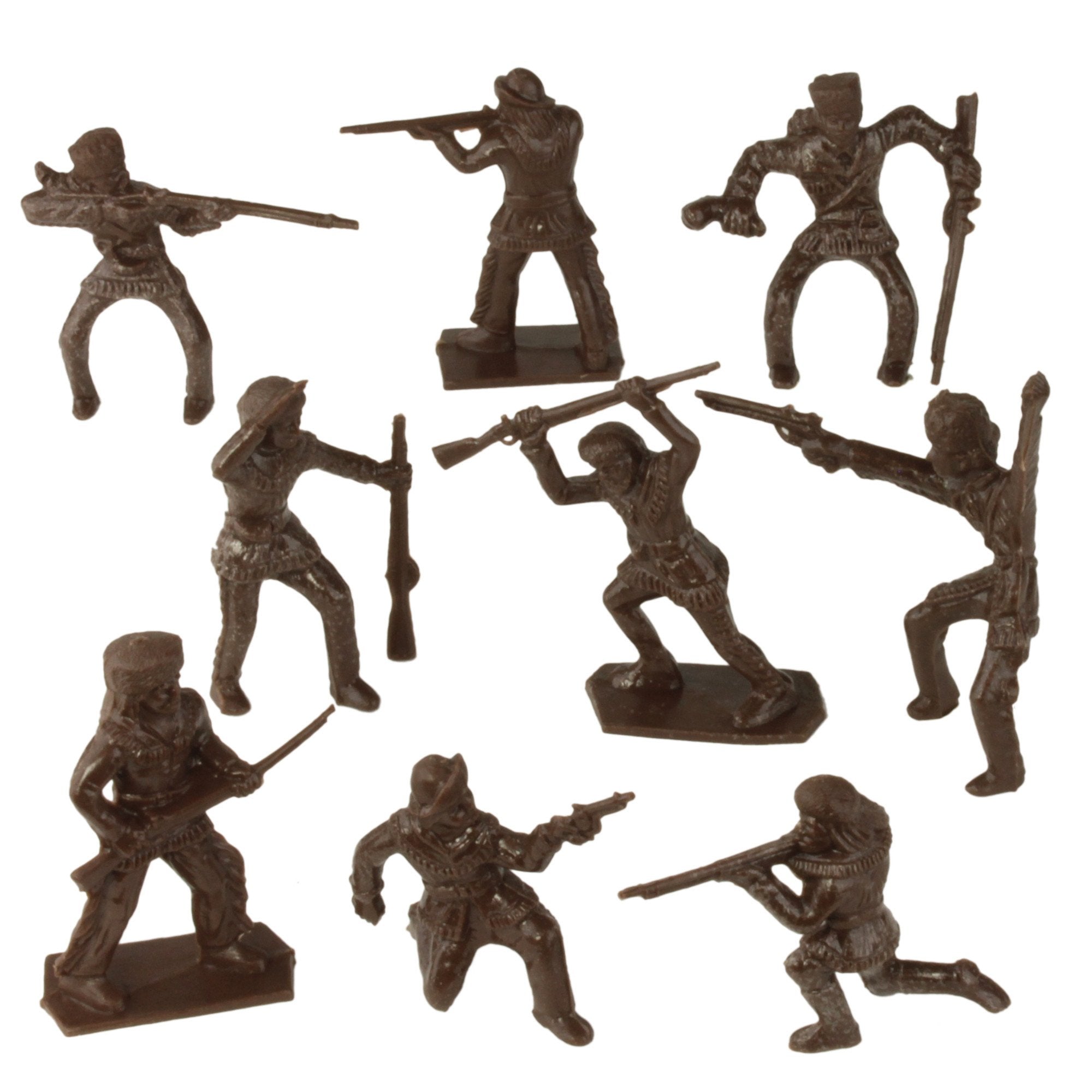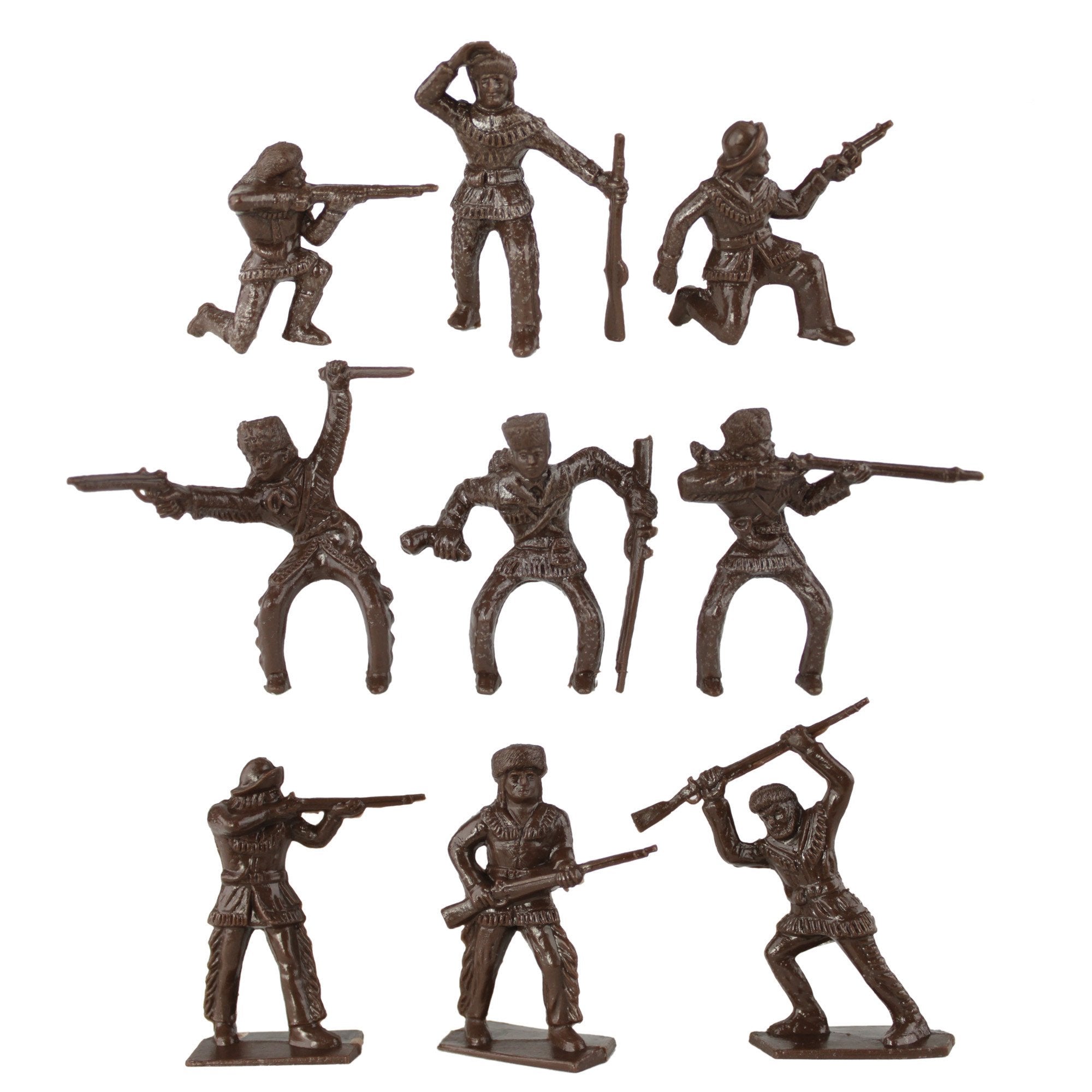 An American Classic is back. This bag of 24 Tim Mee Toy FRONTIERSmen is proudly manufactured in the United States, and includes 24 dark brown figures for maximum play value. There's 9 different figures including 3 riders and 6 on foot in classic and dynamic poses. Figures stand up to 2.7 inches tall (68mm) and are approximately 1:29 scale. Made from slightly stiff LDPE plastic with nice detail and a little bit of flashing. The bow-legged riders and lookout figures don't stand well on their own, but trimming any flash on their feet will help. These 'coonskin cap wearing Pioneers were first produced by Processed Plastic Co. (Tim Mee Toy's parent company at the time) in 1964. Over the years they were branded as either Davey Crockett or Daniel Boone toys depending upon popularity at the time. For their triumphant return to production, the manufacturer has even included the vintage Tim Mee Toy logo on the package. These are real plastic heroes, meant to be set up, knocked down, picked up and played with for years to come. Packed in clear bag with header card and recommended for ages 5 and up.