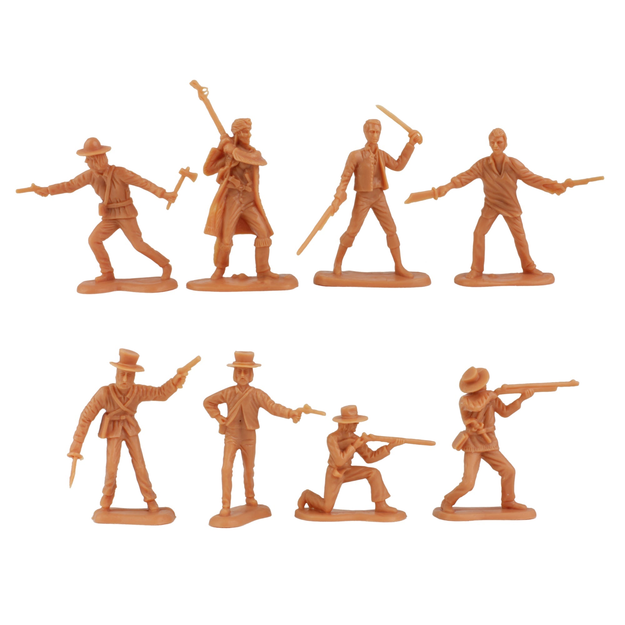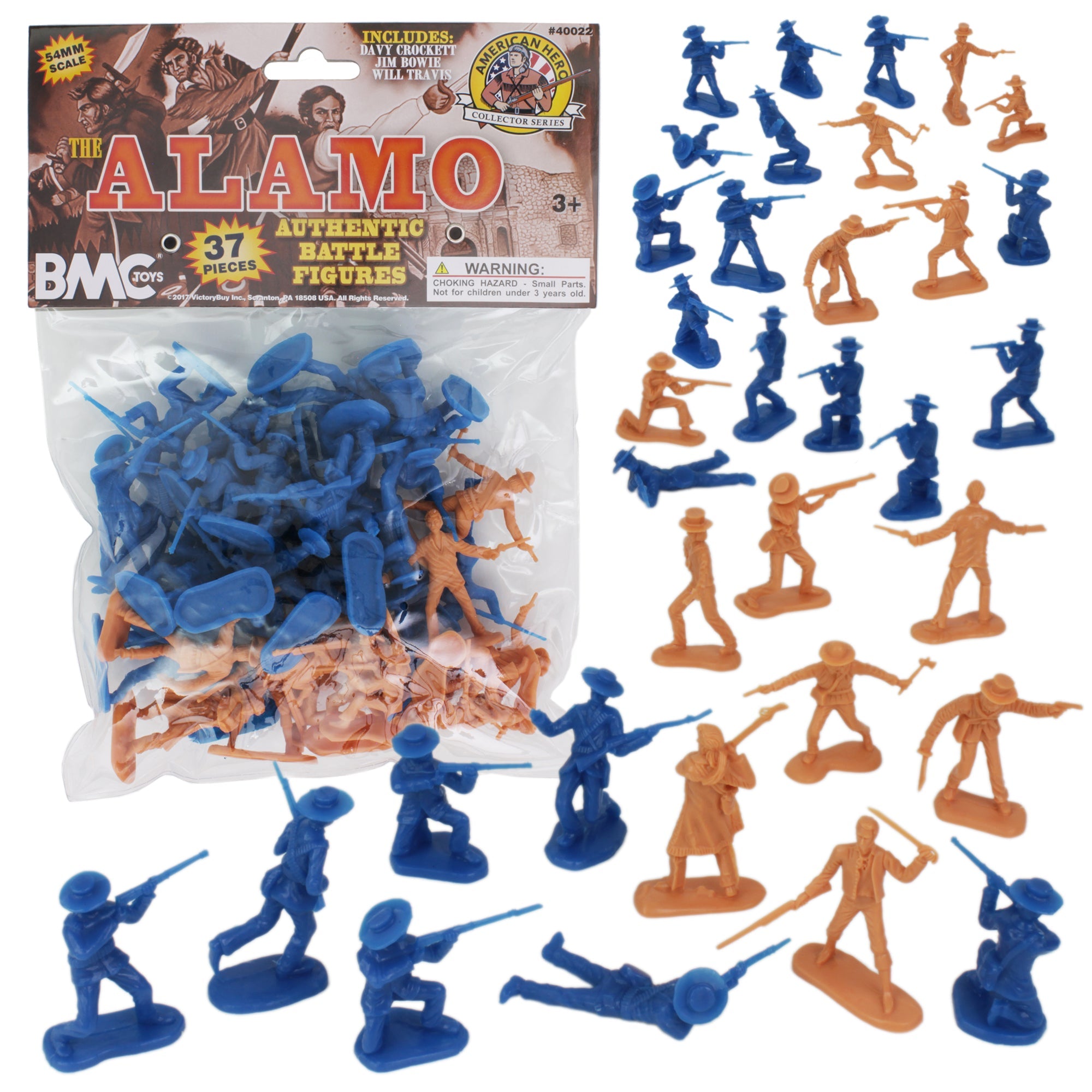 From the BMC Toys American Hero Collector Series, a Battle to remember: The Battle of The Alamo 37 piece Plastic Army Men Set features 14 different figures and includes 13 Texas Volunteers in Butternut Tan and 24 Mexican Soldiers in blue. The Set also includes character figures of Davy Crockett, Jim Bowie, and William B. Travis. Made from fairly stiff, very durable, polypropylene plastic with medium detail and very little flashing, figures stand up to 2.25 inches tall and are about 1:32nd scale. BMC Toys was founded by Bill McMaster in 1991 and specializes in producing historically accurate Plastic Army Men figures and Playsets in the classic realsitic style of the 1950s and 1960s. Packaged in clear bag with header card and recommended for ages 5 and up. The 2017 release features all new header card art.