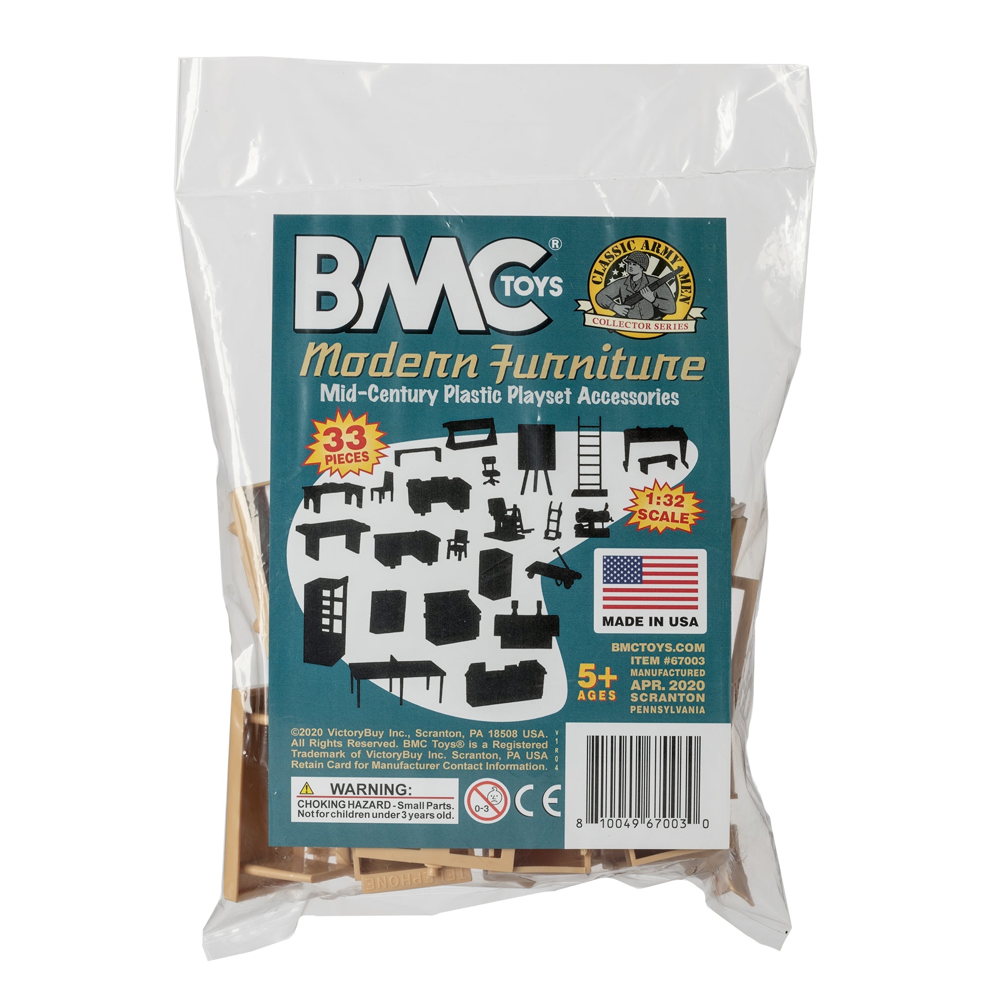 From the Classic Army Men Collector Series, BMC Toys brings back more classic Playset accessories from the Golden Age of American Made toys. This 32 piece Set is made from slightly stiff HDPE plastic with a variety of Mid-Century work, recreation, and school furniture and accessories. Almond-tan color pieces include desks, chairs, conference table, upholstered bench, shop counter, bank customer table, file cabinet, phone booth, exercise horse machine, ping-pong table, hand truck, cabinet with slanted top, skid with handle. Teal-blue pieces include teacher desk, chair, easel, ladder, 2 student desks, 4 student benches, salon chair, and quasi-futuristic stereo TV console. These accessories were first offered in the 1950s by Louis Marx and Co. and were included in a number of their legendary Playsets including The Skyscraper Building, Tom Corbett Space Academy, Space Patrol, Rex Mars, Captain Space, and Operation Moonbase. This new production is manufactured using the original plastic injection tools and are perfect pieces to furnish Playsets, dioramas and even doll houses Set in the mid-20th century time period to present. This is a Set of real American Made toys, meant to be set up, knocked over, picked up, and played with for many years to come. Packed in clear bag bag with insert card and recommended for ages 5 and up.