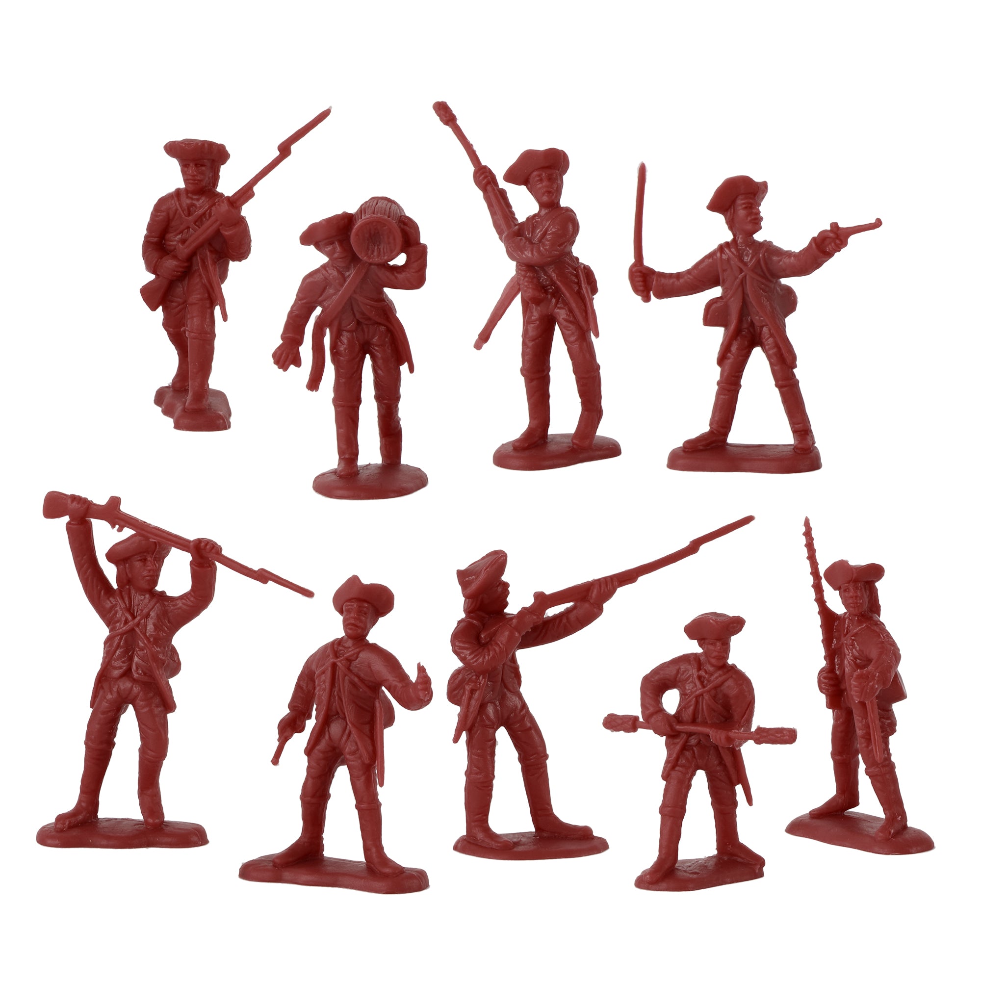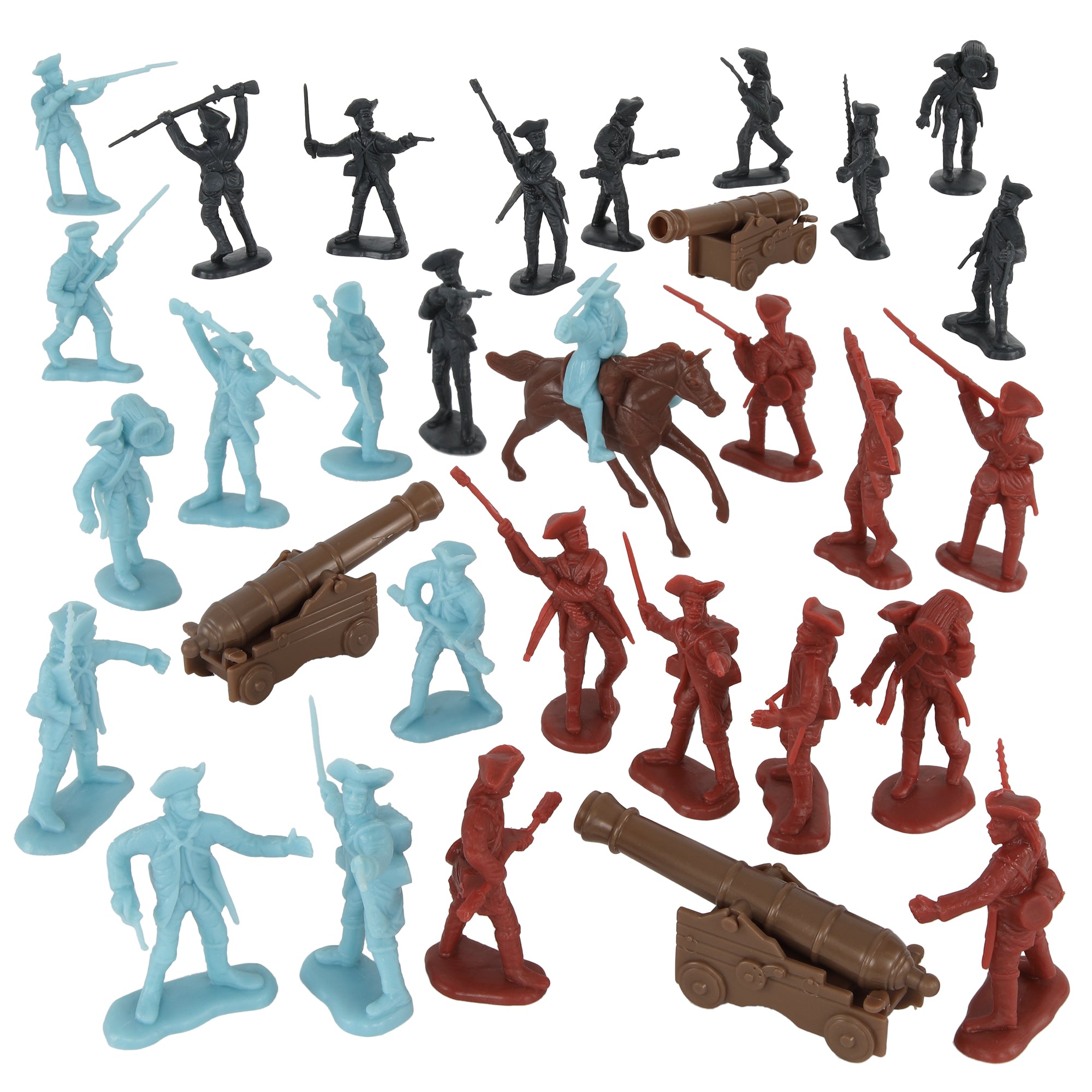 From the BMC Toys American Hero Collector Series, a temporary retreat in New York that led to victory in New Jersey. The American Revolutionary War Battle of White Plains Artillery Attack 32 piece Plastic Army Men Set features 10 different figures and includes 9 Colonial Americans in Powder-Blue, 9 British Empire Redcoats in Deep-Red, and 9 Hessian Soldiers in Coal-Black. Also includes character figure of General George Washington astride his horse 'Old Nelson', and 3 Bronze color Naval 12 Pounder Cannon. The figures are made from fairly flexible LDPE plastic with medium detail, stand up to 2.3 inches tall and are 1:32nd scale. Cannon measure 1 inch x 1 inch x 3 inches long and are made from stiff black color ABS plastic. BMC Toys was founded by Bill McMaster in 1991 and specializes in producing historically accurate Plastic Army Men figures and Playsets in the classic realsitic style of the 1950s and 1960s. Packaged in clear bag with header card and recommended for ages 5 and up.