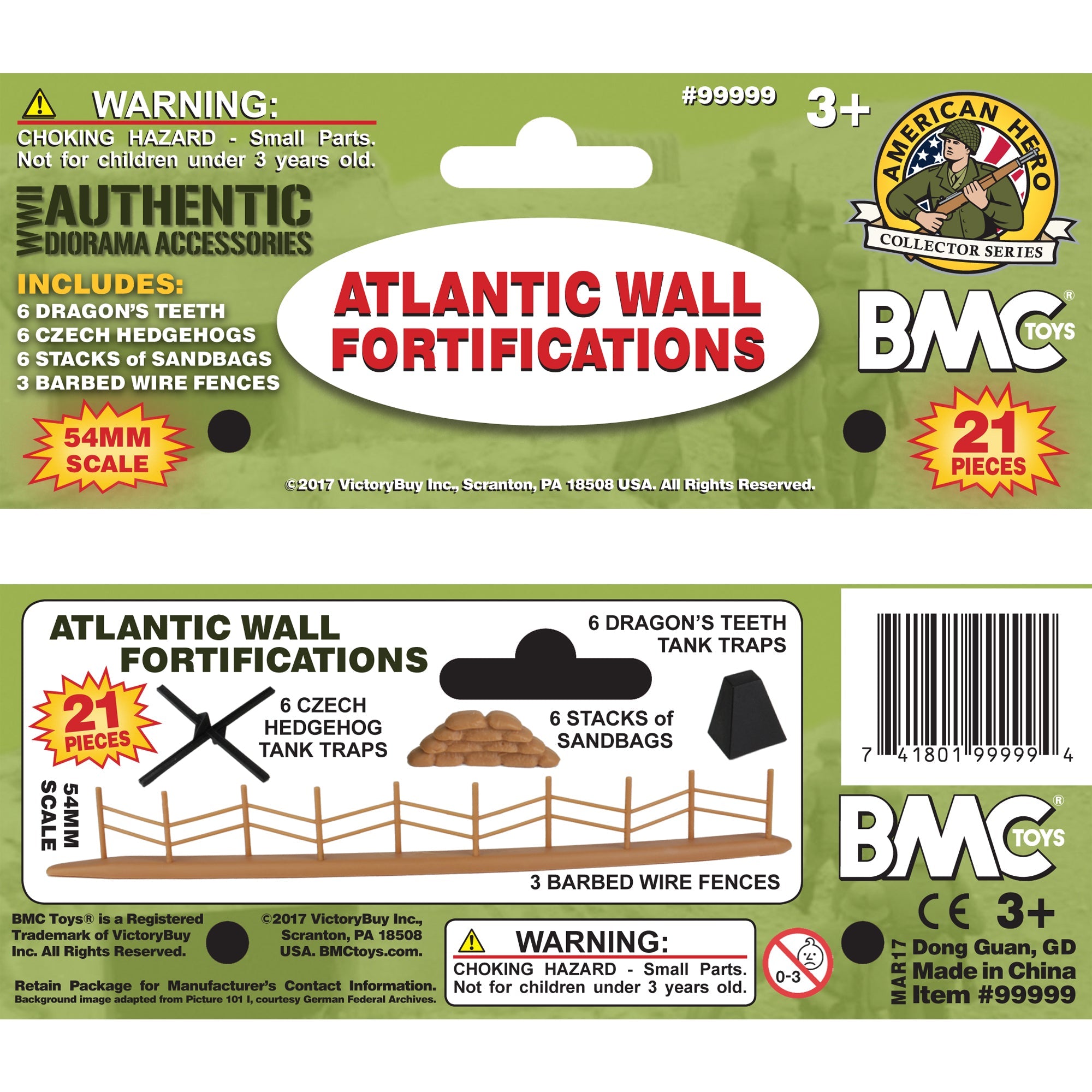 From the BMC Toys American Hero Collector Series, one of the greatest fortifications in military history: The D-Day Atlantic Wall 21 piece accessory Set features 3 Barbed Wire Fence sections, 6 Sandbag Stacks, 6 Dragon's Teeth Tank Traps, and 6 Czech Hedgehog Tank Traps. Made from fairly stiff, very durable, polypropylene plastic with almost no flashing. The fence measures 12.25 inches long. Dragon's teeth 1 inch tall, czech hedgehogs are 2 inches square, and sandbags 2.5x.8x.44 inches. All pieces are about 1:32nd (54mm) scale, but they will work well with many other scales. BMC Toys was founded by Bill McMaster in 1991 and specializes in producing historically accurate Plastic Army Men figures and Playsets in the classic realsitic style of the 1950s and 1960s. Packaged in clear bag with header card and recommended for ages 5 and up. This is a new assortment for 2017 and features all new header card art.