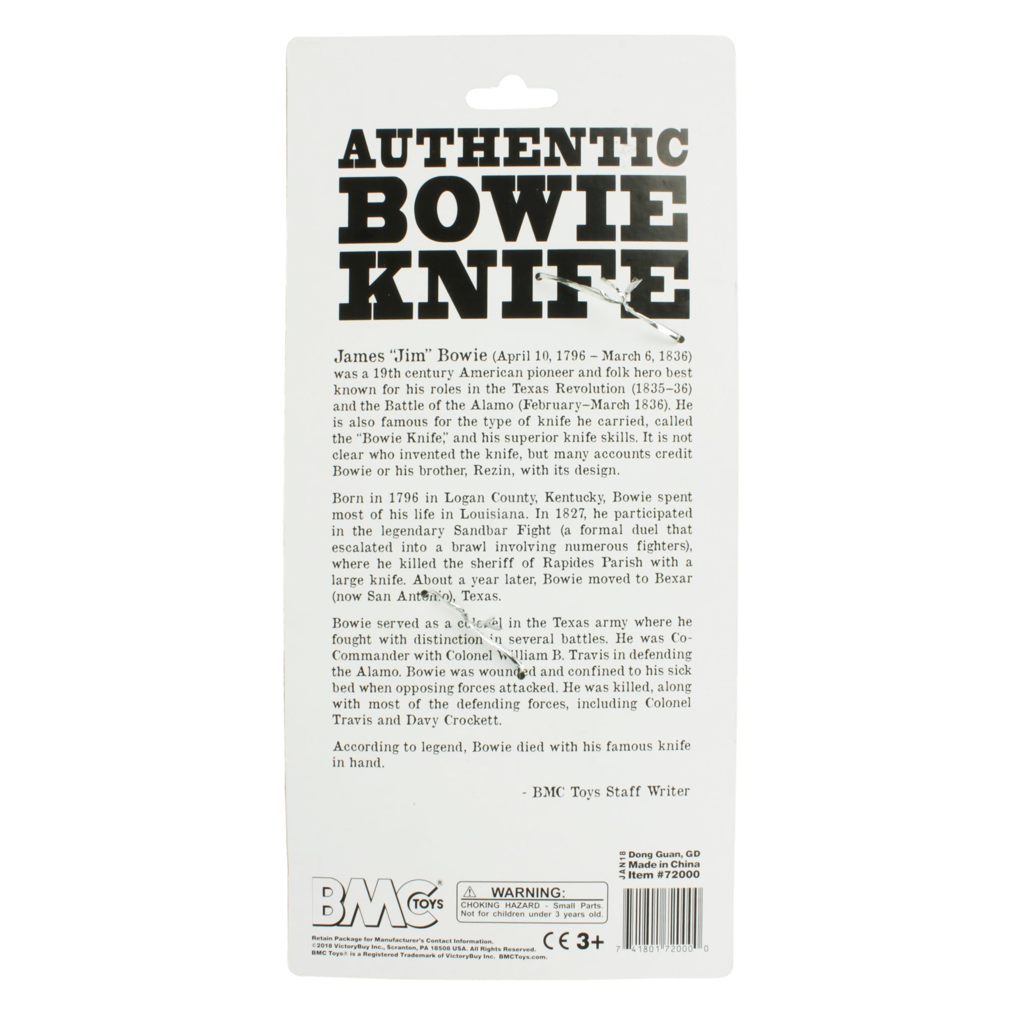 From the BMC Toys American Hero Collector Series, the most memorable weapon from the Battle of The Alamo: Jim Bowie's Knife in full scale as a life size toy or costume prop. Made from fairly stiff, very durable, polypropylene plastic with medium detail, this toy knife measures 15 inches long, just like the real thing. BMC Toys was founded by Bill McMaster in 1991 and specializes in producing historically accurate Plastic Army Men figures and Playsets in the classic realsitic style of the 1950s and 1960s. Packaged on a retail hang card filled with historical facts about James Bowie on the back and recommended for ages 5 and up. Knife has a rounded tip and is not sharp, however adult supervision is still Recommended for younger kids. The 2018 release features all new package art and new dark brown handle color.