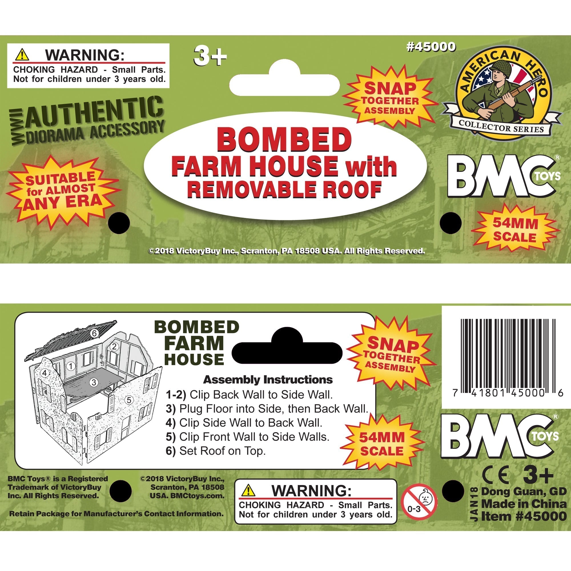 From the BMC Toys American Hero Collector Series: The The Rough Riders Charge up San Juan Hill is an Army Men Playset accessory that fits into almost any Battle from many eras. This barn red building is 2 stories with gray partial second floor and removable partial roof. Features Battle damage and snap together assembly. Made from stiff, very durable, ABS plastic with very little flashing and measures 8 x 5.75 x 7.25 inches tall. Scale is about 1:32nd but will work well with other scales. BMC Toys was founded by Bill McMaster in 1991 and specializes in producing historically accurate Plastic Army Men figures, Playsets and accessories in the classic realistic style of the 1950s and 1960s. Packaged in clear bag with header card and recommended for ages 5 and up. Adult assembly suggested.
