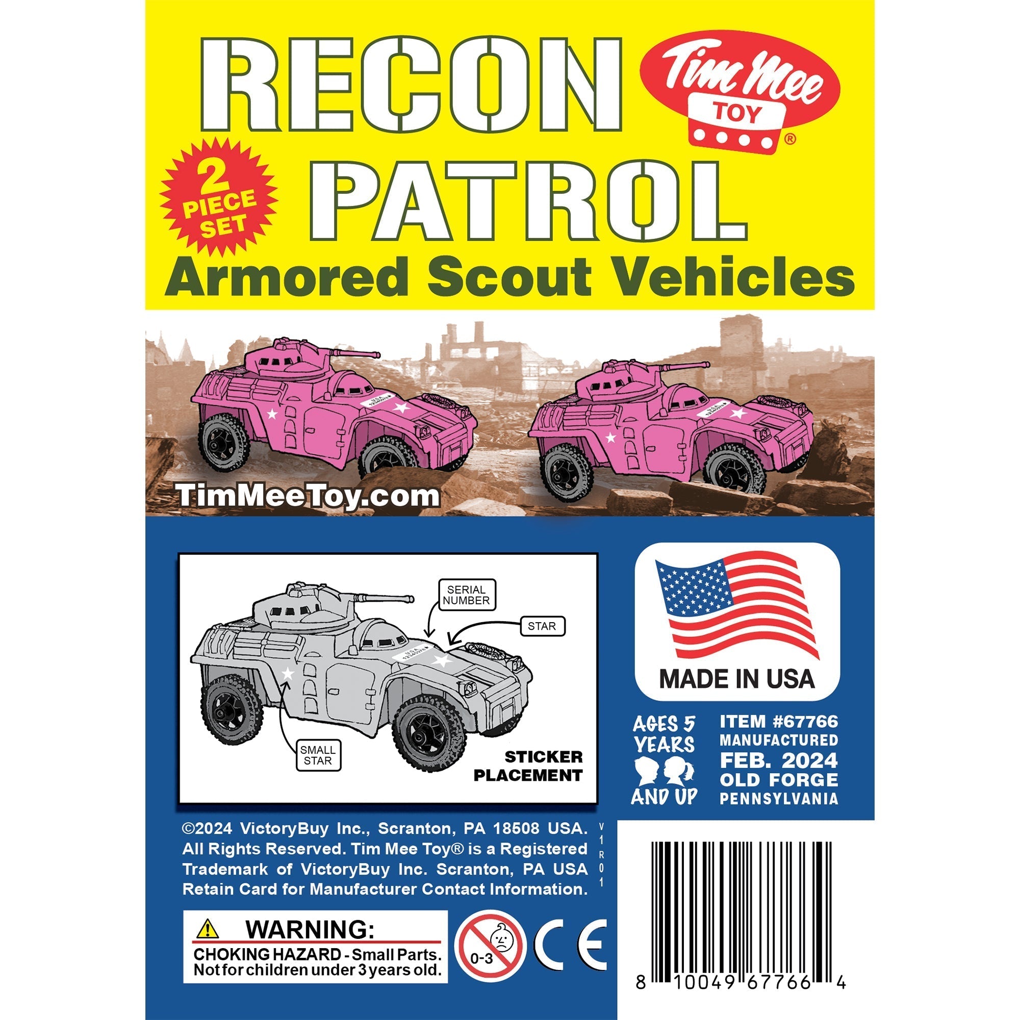 The Tim Mee Toy Recon Patrol is ready to ride again. These Tim Mee Toy #7190 Military Armored Reconnaissance Scout Vehicles are proudly manufactured in the United States. This 2 piece Set of Modern Armored Cars feature turrets that rotate and smooth rolling metal axles. Each car measure 6.25 inches long and approximately 1:32 scale. Made from slightly stiff Pink color HDPE plastic with medium detail and very little flashing. First produced by Processed Plastic Co. (Tim Mee Toy's parent company at the time) in 1984 and modeled after the experimental Lockheed XM800W. This 2023 version has been modified so the hitch is now compatible with the current Tim Mee Toy Combat Patrol M3 Artillery for maximum play value. This is real American made toy, meant to be rolled around, knocked over, picked up and played with for years to come. Packed in clear bag with insert card and includes optional sticker sheet to customize your vehicles. Recommended for ages 5 and up.