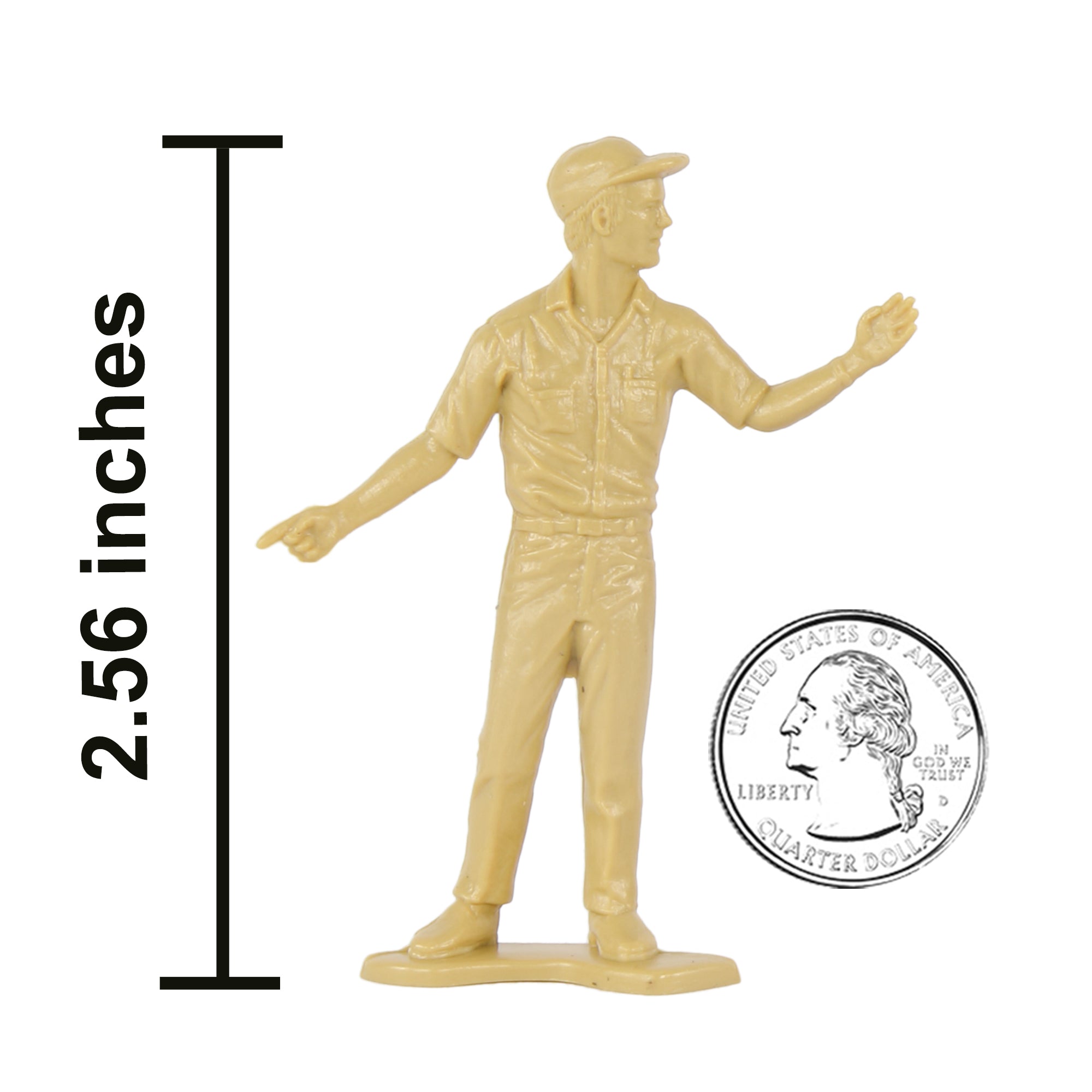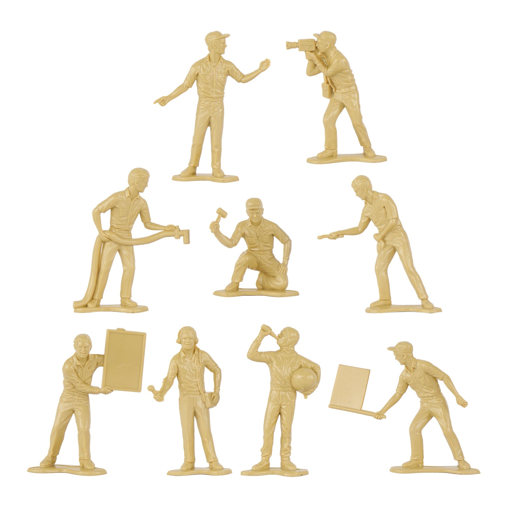 Specialists and Support Crews for your Plastic Army are ready for action. This Set of 18 Tim Mee Toy Plastic Army Men is proudly manufactured in the United States, and includes tan troops in 9 poses for maximum play value. Features test pilot, mechanics, ground crew, and even a film and sound crew. Figures stand up to 2.5 inches tall and are approximately 1:32 scale. Made from slightly flexible LDPE plastic with medium detail, and a little flashing. Originally produced around 1966 by Processed Plastic Co. (Tim Mee Toy's parent company at the time). These figures were initially offered as Speedway Pit Stop Indy Car Racing and later branded as NASCAR. They were usually plastic injection tooled in Red, White and Blue colors and often included with race cars as well as separately in a bag with a traffic cone. These are real plastic heroes, meant to be set up, knocked down, picked up and played with for years to come. Little Green Army Men have even been inducted into the National Toy Hall of Fame. Packed in clear bag with insert card and recommended for ages 5 and up.