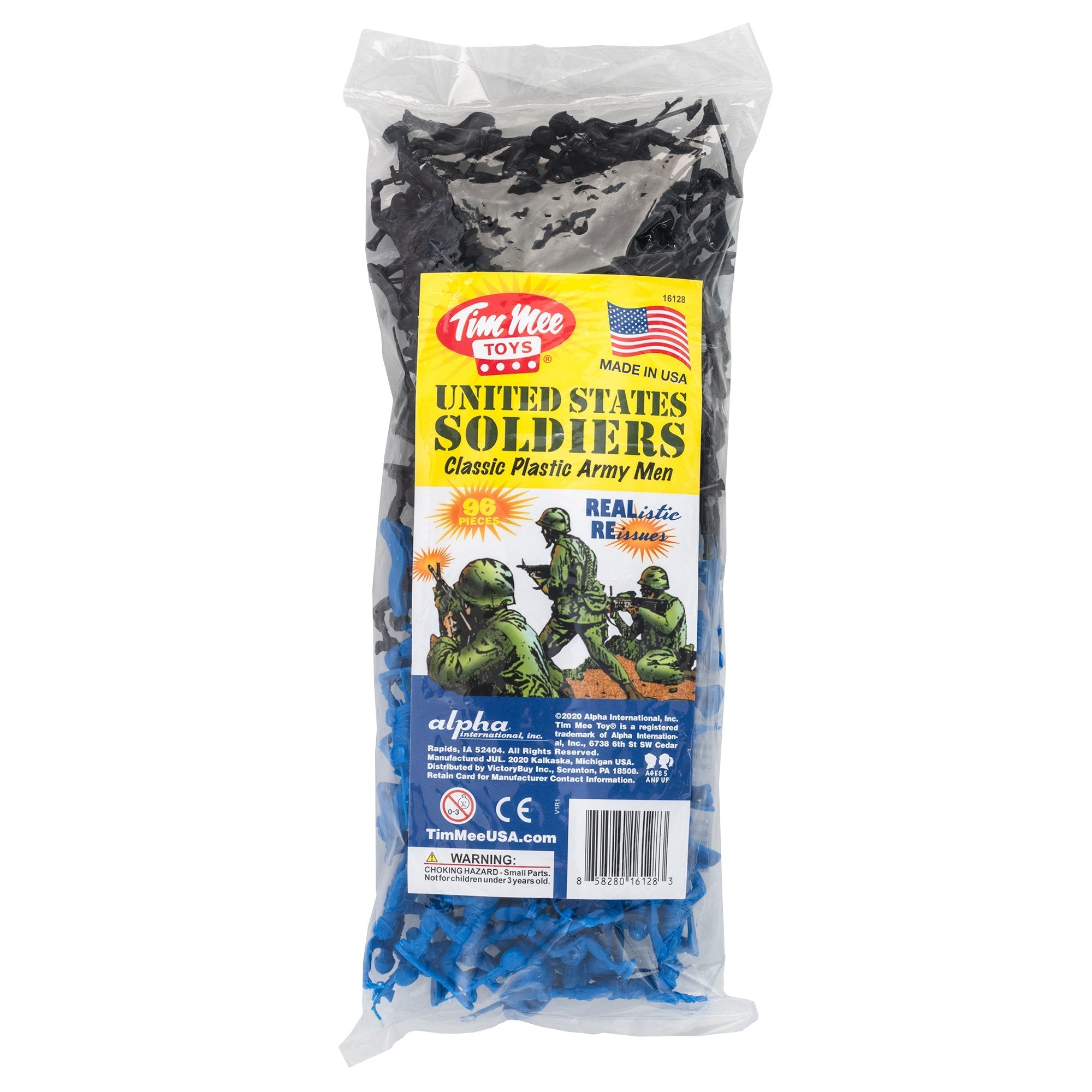 New colors for an American Classic. This pack of 96 Tim Mee Toy Plastic Army Men is proudly manufactured in the United States, and includes 48 black and 48 blue troops for maximum play value. There's about 12 different figures and all your old favorites are here, including minesweeper, bazookaman, radio operator, 60mm mortar, light MGner, kneeling rifleman, flame thrower, crawling rifleman, prone rifleman, bayonet fighter, and officer with binoculars. Figures stand up to 2.1 inches tall and are approximately 1:35 scale. Made from slightly flexible LDPE plastic with medium detail, and just a little flashing. Originally produced by Processed Plastic Co. (Tim Mee Toy's parent company at the time) around 1968, these figures were probably the first to depict US Infantry troops of the Cold War era with contemporary equipment. These are real plastic heroes, meant to be set up, knocked down, picked up and played with for years to come. Little Green Army Men have even been inducted into the National Toy Hall of Fame. Packed in clear bag with header card and recommended for ages 5 and up.