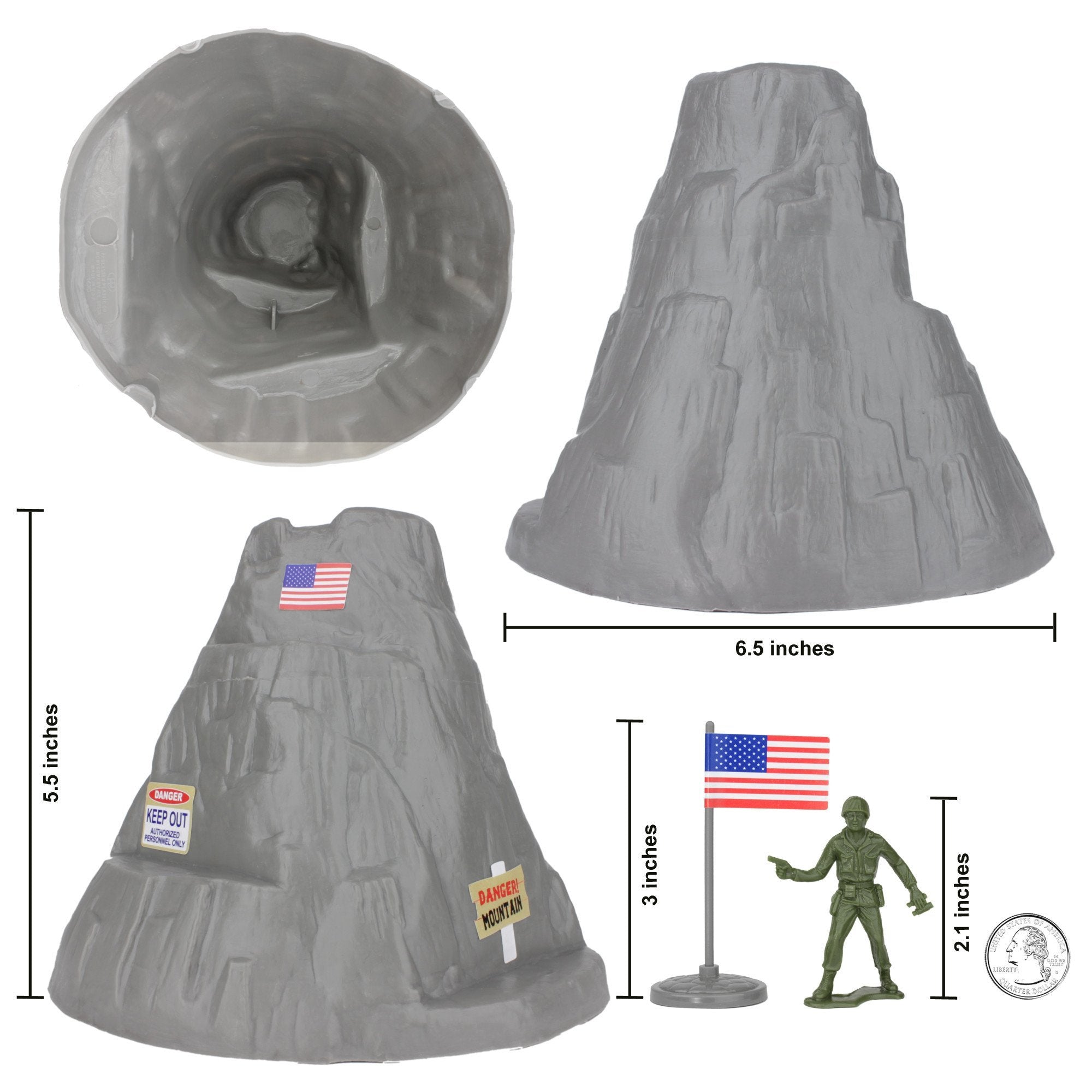 The Original Toy Soldier Bucket is back. The TimMee Desert-Tan vs. Olive-Green Bucket of Army Men includes 24 Olive-Green and 24 Desert-Tan plastic Army guys, a Mountain, Olive-Green Patton Tank, tan Fighter Jets, and 2 flags, all packed in a sturdy plastic bucket. All pieces are proudly manufactured in the United States from HDPE & LDPE plastic with medium detail and just a little flashing. There are 12 different figures and all your old favorites are here, including minesweeper, bazookaman, radio operator, 60mm mortar, light MGner, kneeling rifleman, flame thrower, crawling rifleman, prone rifleman, bayonet fighter, and officer with binoculars. Figures stand up to 2.1 inches tall (54mm). Danger Mountain features 4 precarious ledges and is is made from sturdy gray color plastic (not thin vacu-formed) and measures 6.5 inches diameter by 5.75 inches tall. Tan has air Support from smaller scale F-14 and F-15 Fighter Jets that measure nearly 7 inches long. Green's secrete weapon is their M48 Patton Tank that features a turret that rotates. Scales from 1:32 to 1:100. Bucket arrives packaged in a plain box optimized for shipping directly to you. These are real toys, meant to be set up, knocked over, picked up and played with for years to come. Little Green Army Men have even been inducted into the National Toy Hall of Fame. Recommended for ages 5 and up.