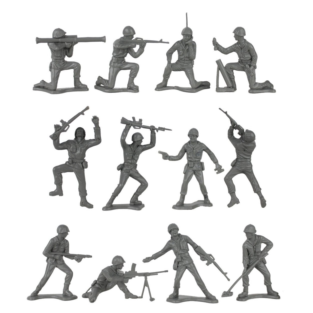 New colors for an American Classic. This bag of 100 Tim Mee Toy Plastic Army Men is proudly manufactured in the United States, and includes 50 gray and 50 red troops for maximum play value. There's about 12 different figures and all your old favorites are here, including minesweeper, bazookaman, radio operator, 60mm mortar, light MGner, kneeling rifleman, flame thrower, crawling rifleman, prone rifleman, bayonet fighter, and officer with binoculars. Figures stand up to 2.1 inches tall and are approximately 1:35 scale. Made from slightly flexible LDPE plastic with medium detail and very little flashing. Originally produced by Processed Plastic Co. (Tim Mee Toy's parent company at the time) around 1968, these figures were probably the first to depict US Infantry troops of the Middle Cold War era with contemporary equipment that included M16 A1 rifles and an experimental Stoner 63A light MG. The manufacturer has even restored the vintage Tim Mee Toy logo that hasn't been seen on the shelves for decades. These are real plastic heroes, meant to be set up, knocked down, picked up and played with for years to come. Little Green Army Men have even been inducted into the National Toy Hall of Fame. Packed in clear bag with header card and recommended for ages 5 and up.
