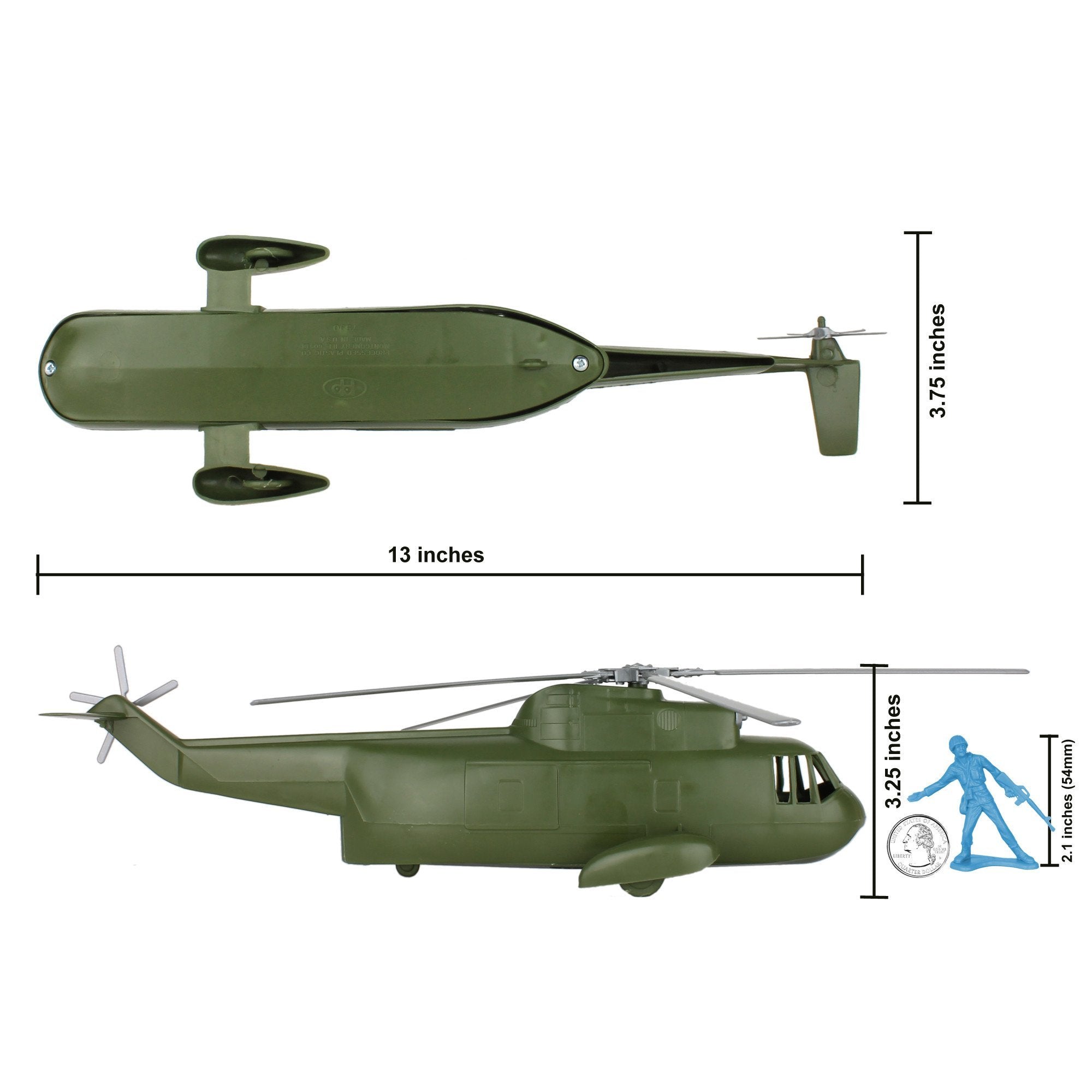 Air Extraction for your Plastic Army Men has arrived. The Tim Mee Toy Military Rescue 'Copter is once again proudly manufactured in the United States and available as this 26 piece Set. Set includes an olive-green Sea King Helicopter, American flag with base, and 2 dozen cyan-blue M16 Soldier figures. The chopper is modeled after the Sikorsky SH-3 and features spinning main rotor and stationary landing wheels. The fuselage measures 13 inches long, 3.25 inches tall and 3.75 inches wide. The aircraft is made from slightly stiff olive-green color HDPE plastic and the Soldiers are made from slightly flexible LDPE plastic, both have very little flashing. The helicopter is approximately 1:48 scale and the figures are 1:35 scale. The first version of this aircraft was produced by Processed Plastic Co. (Tim Mee Toy's parent company at the time) in the 1970's and was later modified to add the open side hatch. Production was discontinued in the 1980's and wasn't available again until it was reissued in 2013. This version of the Rescue 'Copter includes the classic stickers that were discontinued decades ago. The stickers are supplied on a sheet and placement is included with assembly instructions. Playset arrives packaged in a plain brown box optimized for shipping directly to you. These are real American Made toys, meant to be set up, knocked over, picked up and played with for years to come. Snap-together assembly requires some hand strength, so adult assembly is suggested. Recommended for ages 5 and up.
