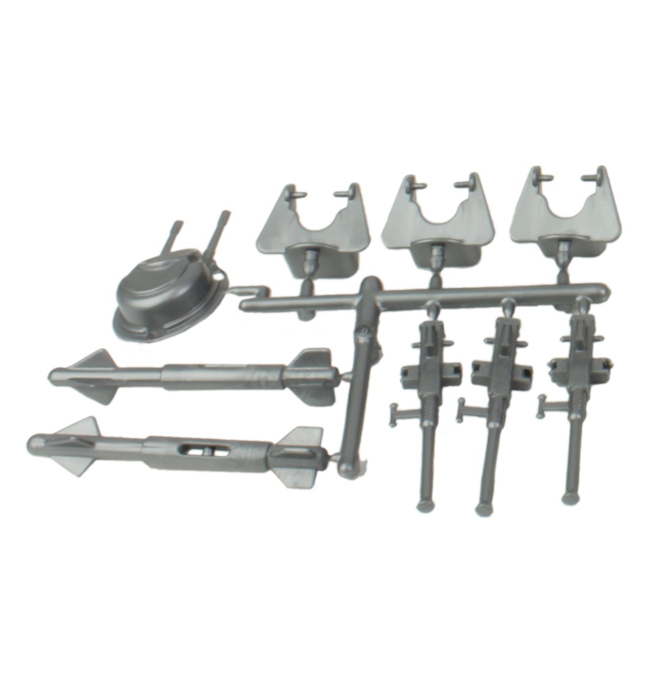 Parts include 1 dual barrel turret, 3 pivoting MGs, 2 wing missiles. The parts are made from slightly stiff Silver-Gray color HDPE plastic.