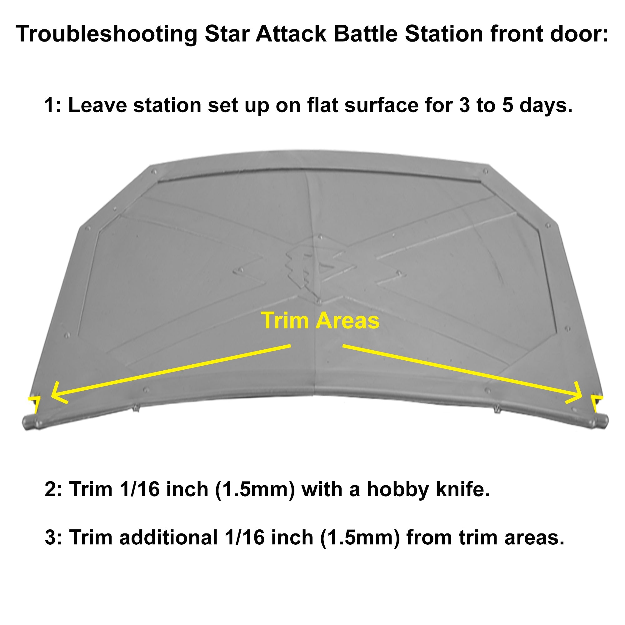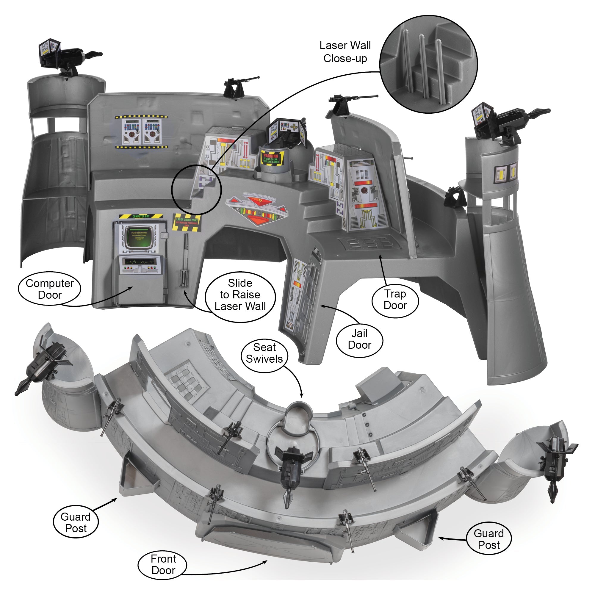 The Tim Mee Toy Star Attack Battle Station is ready for action. This huge Playset is scaled for 3-3/4 inch action figures (1:18th scale) and is proudly made in the United States. Packed with features to maximize the fun. The station features a Large 9 inch by 4.75 inch main entrance door, 3 photon cannon, targeting station with seat that swivels, 6 pivoting lasers, 2 detachable towers, 2 guard posts, a laser wall that can be raised and lowered, computer room door, jail and trap doors. The Set also includes extra figures accessories: 4 swords, 4 communicators, 2 backpacks, 2 boomerangs, 4 laser blasters, and 5 extra photon torpedoes. The station measures 38.5 inches across,13 inches tall and 14 inches deep and made from Silver-Gray color HDPE plastic. The accessories are made from black HDPE plastic. This giant action figure scale Playset was produced by Processed Plastic Co. (Tim Mee Toy's parent company at the time) around the late 1990's for a very short period of time. It was offered in Big Box and Toy Stores as a generic Playset compatible with Star Wars, GI Joe, Batman and other 3-3/4 inch action figures. This reissue features updated colors and the missile launchers are now non-firing to meet current safety standards.. Please read important product notes: Adult assembly is required. Snap-together assembly requires hand strength and some tab slots may need a small amount of trimming with a hobby knife for best fit. Some plastic parts may deform slightly during storage and shipping, but will return to original shape within a few days. This is a real American Made toy, meant to be played with for years to come. Recommended for ages 5 and up.