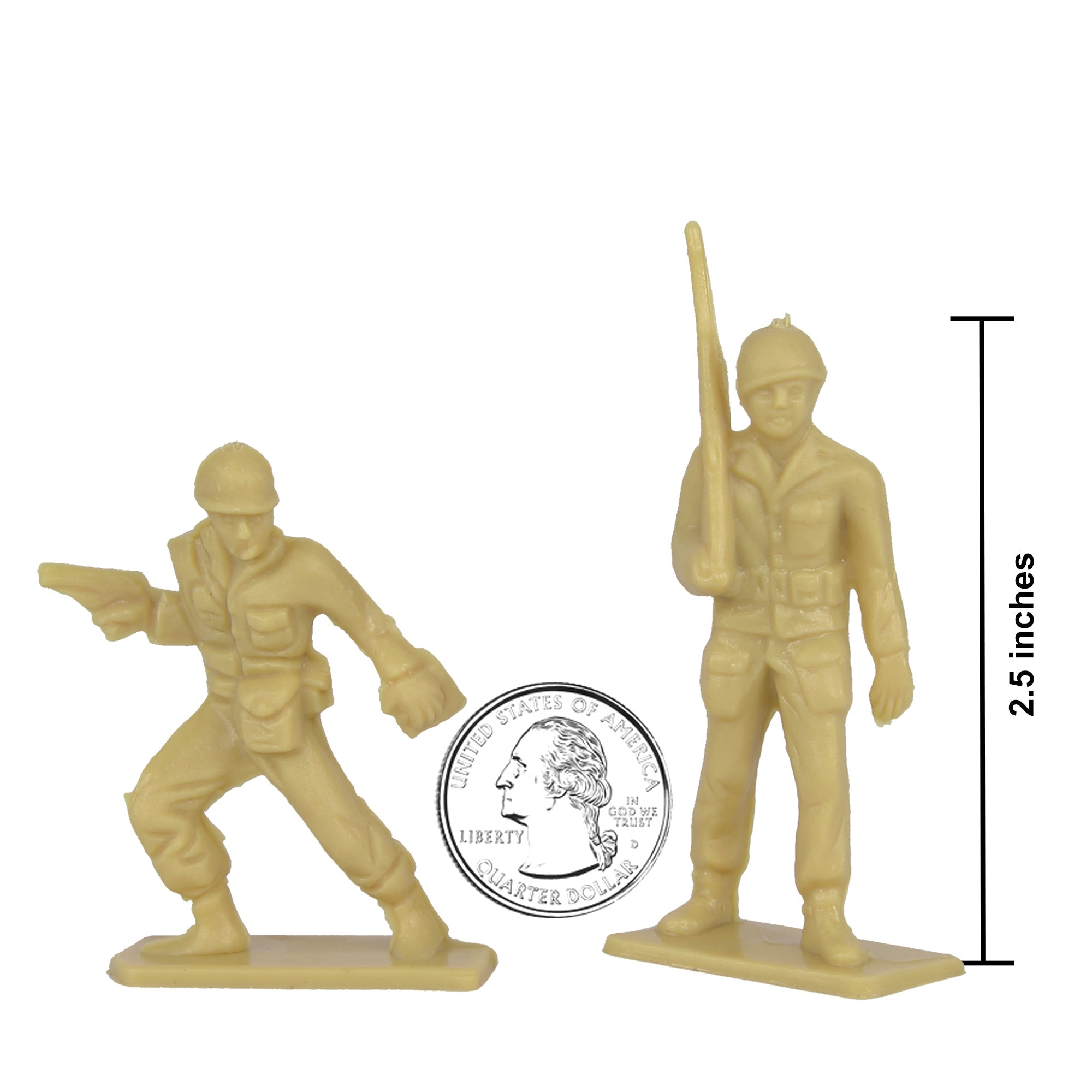 Tim Mee Toy brings back some classic WW2 troops. This bag of 28 TanPlastic Army Men is proudly manufactured in the United States. The Set features 11 different figures, and all your old favorites are here: Marching, Advancing with Bayonet, Overhead Bayonet, Grenade Thrower, Grease MG operator, Mine Sweeper, MGner, Radio Operator, Crawling with Rifle, Prone with Rifle, and Officer with Binoculars. Figures are approximately 1:32 scale and stand up to 2.5 inches tall. Figures stand well on their own except for the Radio Operator which often needs to be propped up. Made from slightly flexible LDPE plastic with medium detail and some flashing.
