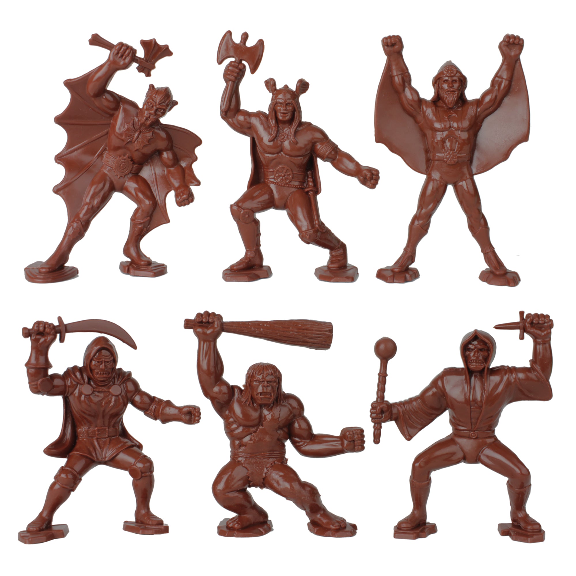 There's 6 different figures including Saber Tooth Caveman, Viking Hero, Super Sorcerer, Bat-Wolfman, Skull-Sorcerer, and Secret Samurai Warrior. Figures stand up to 3.1 inches tall and are about 1:24 scale. Made from slightly flexible LDPE plastic with excellent detail and very little flashing.