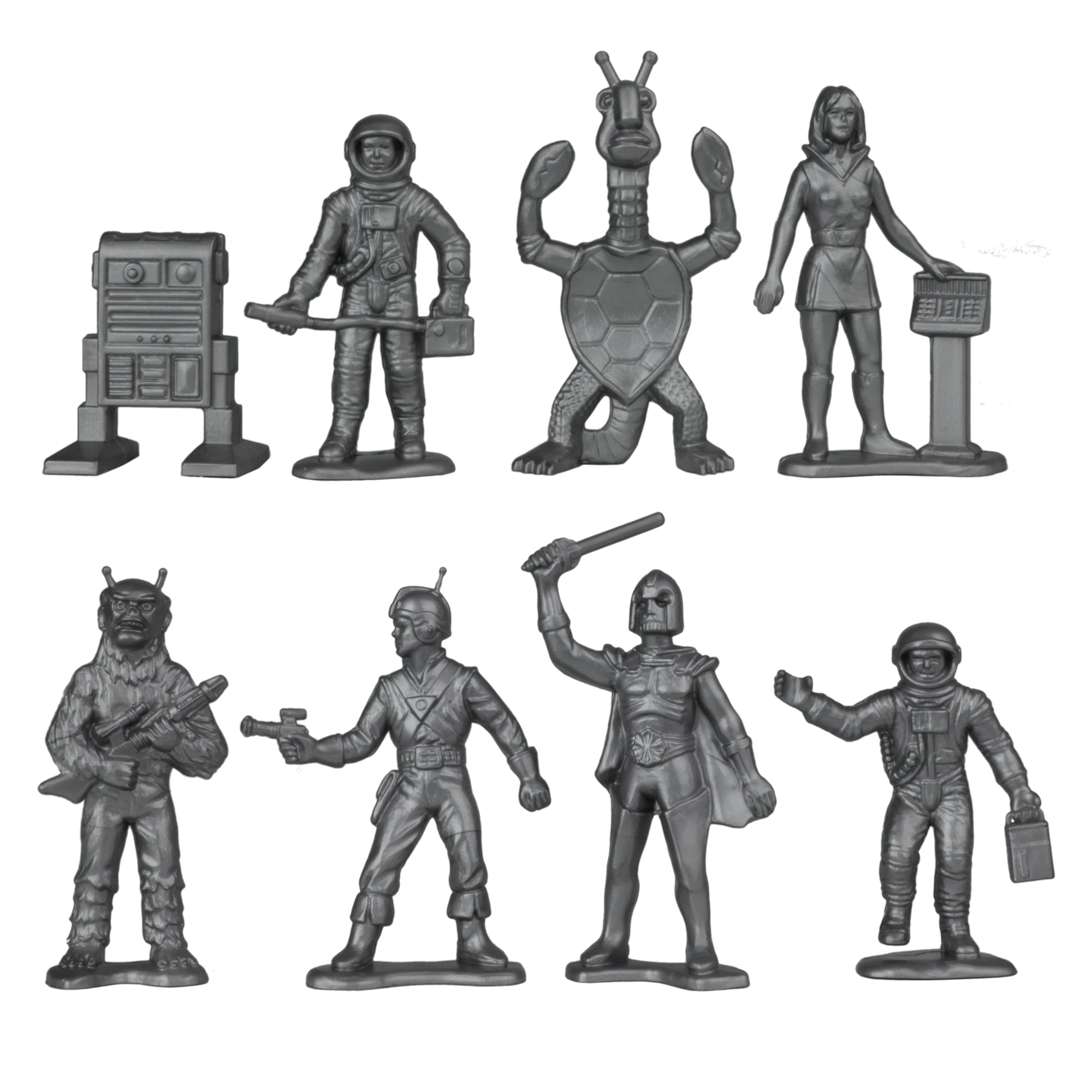 From a Galaxy far-out and away, an underground Sci-Fi classic from the 70's is back. This Set of 50 Tim Mee Toy Galaxy Laser Teamn with Space Monsters figure Set is proudly manufactured in the United States, and includes 24 Black and 24 Silver-Gray figures along with 2 small space fighters for maximum play value. All your old favorites are here, including turtle-lobster alien, space-sasquatch alien, classic serial space hero, mailbox-shaped droid, sword-wielding villain, 2 Mercury era astronauts, and even the heroine with her trusty computer console. Figures stand up to 2.25 inches tall and are approximately 1:35 scale. X-wing rockets are 3.75 inches long and smaller scale. Made from slightly flexible LDPE plastic with medium detail and very little flashing. Originally produced by Processed Plastic Co. (Tim Mee Toy's parent company at the time) around 1978, they were also branded as Star Patrol with X-Wing Rocket and Outer Space Fighters. These figures celebrate a funky mash-up of space movie characters from the old black and white serials to that famous space opera in a galaxy far-far away. Package includes an optional sticker sheet to customize your star fighters. These are real plastic heroes and villains, meant to be set up, knocked down, picked up and played with for many years to come. Packed in clear bag with insert card and recommended for ages 5 and up.