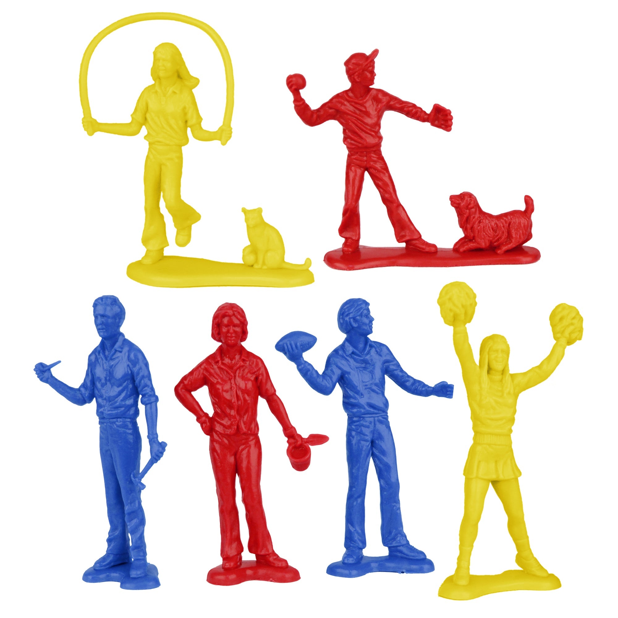 From a time not so long ago and from a place that may or may not have existed, comes the quintessential nuclear family, forever frozen in plastic perfection. The Tim Mee Toy People at Play figure Set is proudly manufactured in the United States, and includes 6 each Yellow, Red, and Blue color figures for maximum play value. Six different figures are included and the whole family is here - classic Dad with his pipe and hammer, gardening Mom with her trowel and flower pot, Jr. casually tossing a football, Sis at cheerleader practice, Little Brother playing baseball with the family dog, and Little Sister jumping rope as her cat calmly supervises. Figures stand up to 2.5 inches tall and are about 1:35 to 1:32 scale. Made from slightly flexible LDPE plastic with crisp detail and almost no flashing. Originally produced by Processed Plastic Co. (Tim Mee Toy's parent company at the time) in the 1970s, they are often referred to by Collector as Suburban Family Figures, People Play Figures, or just People Figures. This idyllic family represents a bygone era of folks enjoying leisurely activities on a sunny afternoon, but they are incredibly versatile pieces for use in train layouts, dioramas or dollhouses. They'll fit into almost any Playset alongside Little Green Army men, space aliens, as B-Movie victims, zombie apocalypse survivors, or even Dinosaur tourists. Packed in clear bag with insert card that features vintage mid-century advertising art. These are real American made plastic toys, meant to be set up, knocked down, picked up and played with for years to come. Recommended for ages 5 and up.