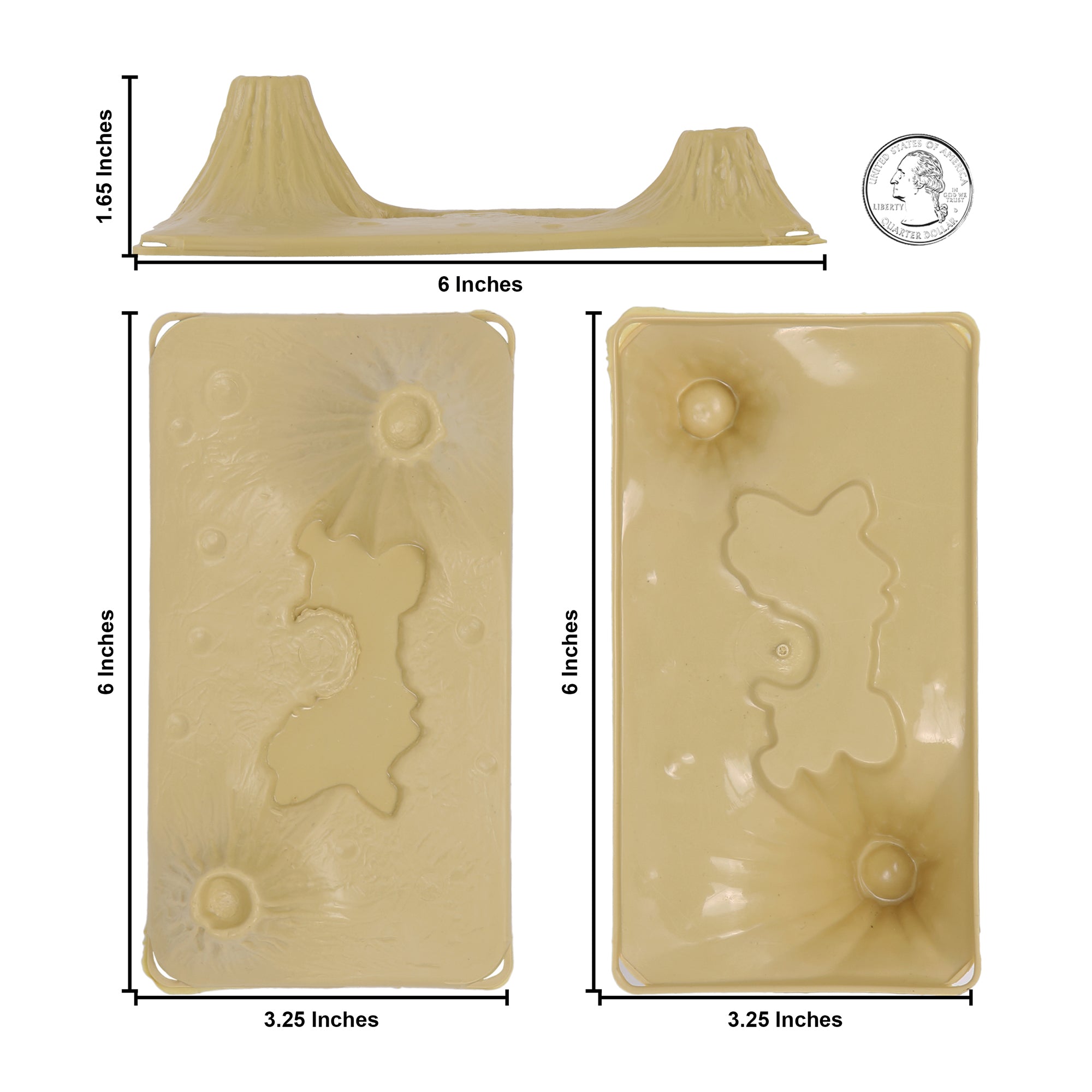 The Tim Mee Toy 3 piece Miniature Volcanic Scenery is proudly manufactured in the United States and features 2 small volcanoes and small lagoon. Made from Tan color HDPE plastic, the Terrain measures 6 inches wide, 3.25 inches deep, and stands1.65 inches tall. Works with lots of different figure scales including HO, 28mm, 54mm, 1:32, and even 3.75 inch tall action figures as small geyser formations.