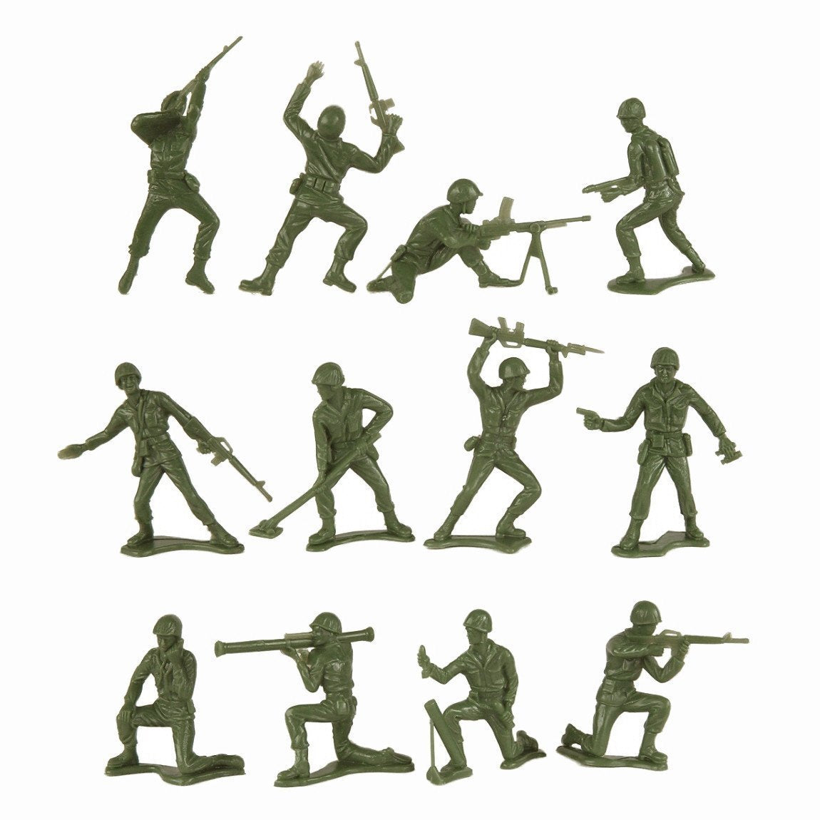 | The Original Toy Soldier Bucket is back. The TimMee Desert-Tan vs. Olive-Green Bucket of Army Men includes 24 Olive-Green and 24 Desert-Tan plastic Army guys, a Mountain, Olive-Green Patton Tank, tan Fighter Jets, and 2 flags, all packed in a sturdy plastic bucket. All pieces are proudly manufactured in the United States from HDPE & LDPE plastic with medium detail and just a little flashing. There are 12 different figures and all your old favorites are here, including minesweeper, bazookaman, radio operator, 60mm mortar, light MGner, kneeling rifleman, flame thrower, crawling rifleman, prone rifleman, bayonet fighter, and officer with binoculars. Figures stand up to 2.1 inches tall (54mm). Danger Mountain features 4 precarious ledges and is is made from sturdy gray color plastic (not thin vacu-formed) and measures 6.5 inches diameter by 5.75 inches tall. Tan has air Support from smaller scale F-14 and F-15 Fighter Jets that measure nearly 7 inches long. Green's secrete weapon is their M48 Patton Tank that features a turret that rotates. Scales from 1:32 to 1:100. Bucket arrives packaged in a plain box optimized for shipping directly to you. These are real toys, meant to be set up, knocked over, picked up and played with for years to come. Little Green Army Men have even been inducted into the National Toy Hall of Fame. Recommended for ages 5 and up.