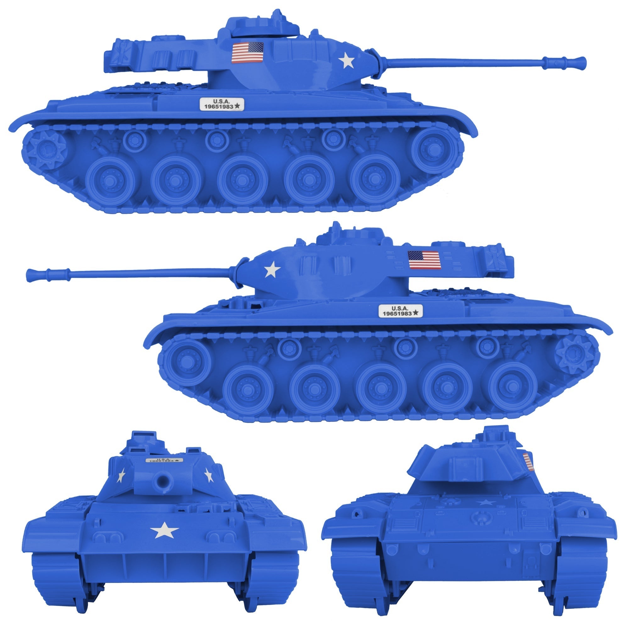 The Tim Mee Toy Walker Bulldog M48 Tank 13 piece Playset is ready for your next backyard battle. This #7520 Tanks is proudly manufactured in the United States and includes 12 tactical soldier figures. The Tank features an elevating barrel, turret that rotates, hatch that opens to reveal a fixed Tank commander, rolling wheels, and a storage compartment in the back. It measures 10.25 inches long (14 inches including barrel), 6 inches wide and is approximately 1:24 scale. Made from slightly stiff Blue color HDPE plastic with lots of crisp detail. The figures are made from slightly flexible LDPE plastic and feature a high level of detail with very little flashing. Figures stand up to 2.6 inches tall, are approximately 1:30 scale. This Tank was first produced around 1983 by Processed Plastic Co. (Tim Mee Toy's parent company at the time). Modeled after the M41 Walker Bulldog Light-Tank, and often described it as an M60 Tank. The figures were first produced as S.W.A.T. police in the late 1970's. As an extra bonus, a sticker sheet is included with stars, flags and the classic Tim Mee Toy serial numbers. This is one of the Largest Army Men type Tanks ever made and dwarfs the 1:48 scale Tim Mee Toy Patton Tanks. These are real toys, meant to be set up, knocked over, picked up and played with for years to come. Packaged in a plain clear bag and recommended for ages 5 and up.